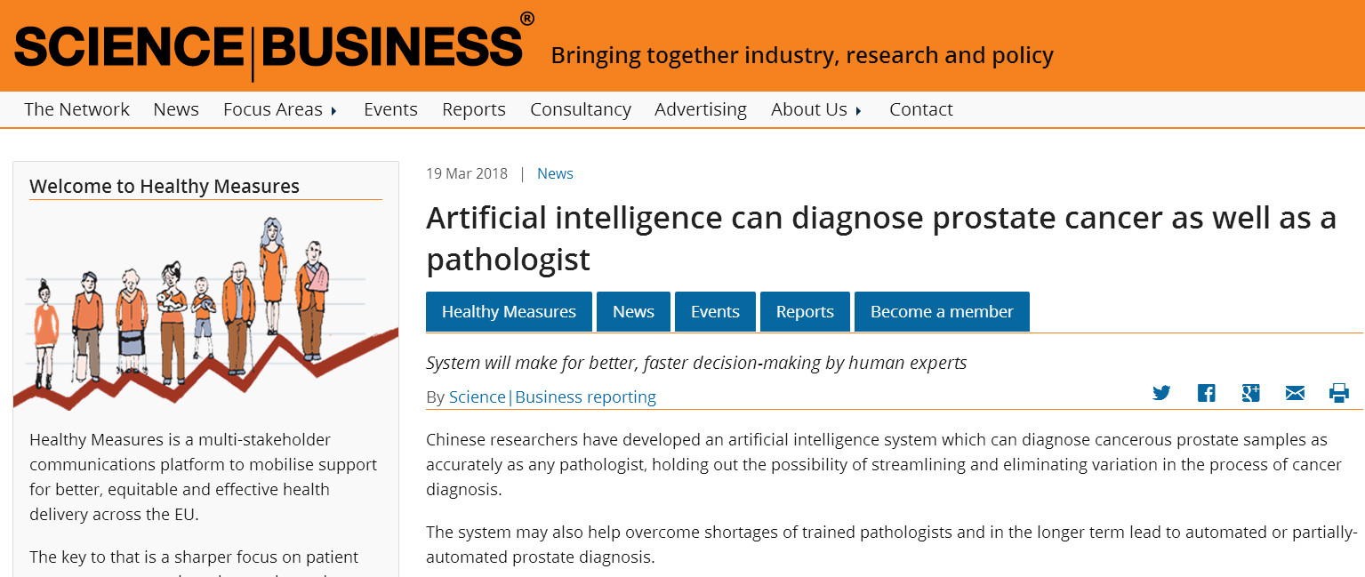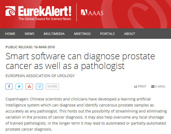 今年,鼓樓醫(yī)院與云創(chuàng)大數(shù)據(jù)聯(lián)合研究的人工智能程序,對(duì)于前列腺癌的診斷準(zhǔn)確率達(dá)到了99.38%。此項(xiàng)聯(lián)合研究成果得到《泰晤士報(bào)》、《福布斯》、《每日郵報(bào)》、《優(yōu)瑞科》等媒體的廣泛報(bào)道。