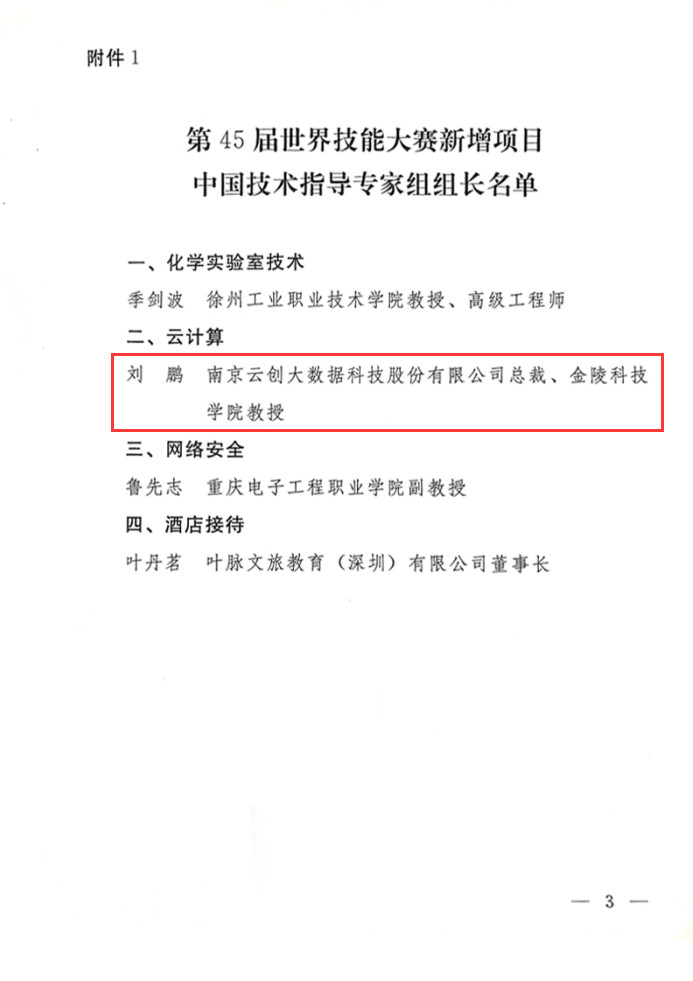 近日,國(guó)家人社部發(fā)函,公布第45屆世界技能大賽新增項(xiàng)目中國(guó)技術(shù)指導(dǎo)專(zhuān)家組組長(zhǎng)名單以及中國(guó)集訓(xùn)基地名單。其中,清華大學(xué)博士、南京云創(chuàng)大數(shù)據(jù)科技股份有限公司總裁劉鵬教授在繼中國(guó)云計(jì)算選拔賽裁判長(zhǎng)之后,再度被國(guó)家人社部任命為第45屆世界技能大賽云計(jì)算中國(guó)技術(shù)指導(dǎo)專(zhuān)家組長(zhǎng)。