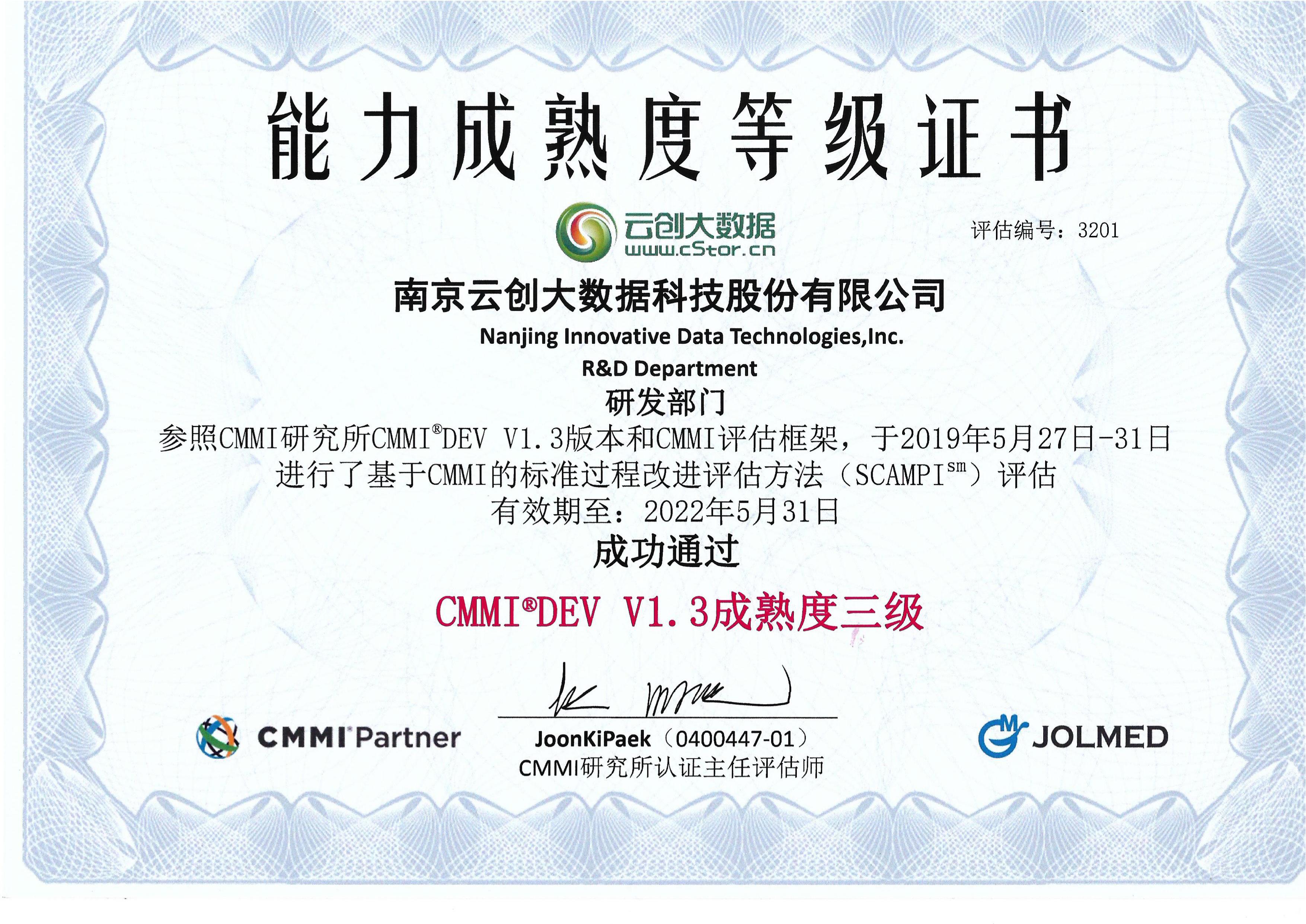 2019年5月31日,在南京云創(chuàng)大數(shù)據(jù)科技股份有限公司舉行的CMMI3級認證結果發(fā)布會上,CMMI Institute Partner 外籍評估師Joonki Paek正式宣布:經(jīng)過嚴格的現(xiàn)場審核和評估,云創(chuàng)大數(shù)據(jù)已經(jīng)達成CMMI3級目標,成功通過CMMI3級認證。