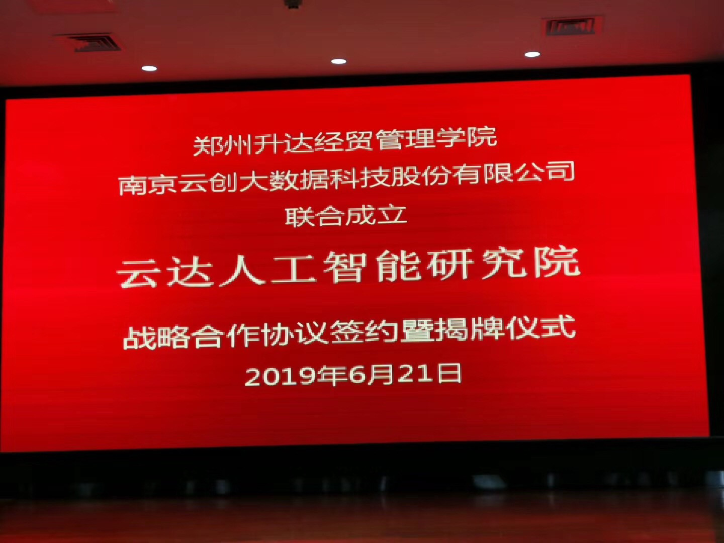 2019年6月21日,鄭州升達經(jīng)貿(mào)管理學院與南京云創(chuàng)大數(shù)據(jù)科技股份有限公司聯(lián)合成立云達人工智能研究院戰(zhàn)略合作協(xié)議簽約暨揭牌儀式在該校雙創(chuàng)大講堂舉行。該校董事會執(zhí)行董事王新奇博士、吳益民副校長、信息工程學院院長李學橋教授、副院長白鑫副教授出席了本次儀式,該儀式由副校長吳益民主持。清華大學博士、云創(chuàng)大數(shù)據(jù)總裁、中國大數(shù)據(jù)應(yīng)用聯(lián)盟人工智能專家委員會主任劉鵬教授同時受邀參加。