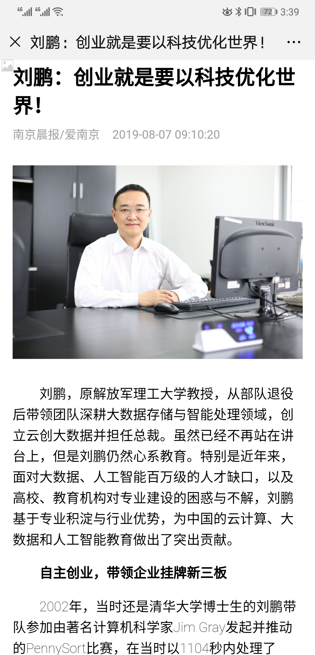 8月7日,《南京晨報(bào)》A10版“不忘初心、牢記使命——南京市退役軍人創(chuàng)新創(chuàng)業(yè)人才專題”對(duì)原解放軍理工大學(xué)教授、清華大學(xué)博士、中國(guó)大數(shù)據(jù)應(yīng)用聯(lián)盟人工智能專家委員會(huì)主任、云創(chuàng)大數(shù)據(jù)總裁劉鵬教授進(jìn)行了大篇幅報(bào)道。該篇文章《劉鵬:創(chuàng)業(yè)就是要以科技優(yōu)化世界》圍繞“自主創(chuàng)業(yè),帶領(lǐng)云創(chuàng)掛牌新三板”和“心系教育,為學(xué)生搭建多座平臺(tái)”,對(duì)劉鵬教授的創(chuàng)新創(chuàng)業(yè)經(jīng)歷進(jìn)行了詳細(xì)介紹。全文如下: