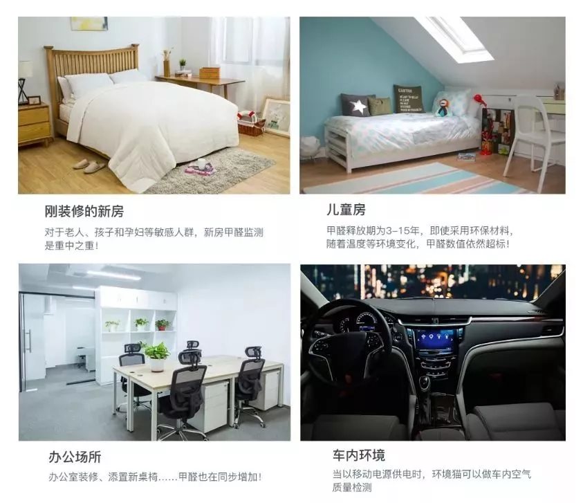環(huán)境貓小巧便攜,插電即用,與充電寶配套靈活使用,多種場(chǎng)合實(shí)時(shí)監(jiān)測(cè),特別適用于剛裝修的新房、兒童房、辦公場(chǎng)所、車(chē)內(nèi)環(huán)境等。