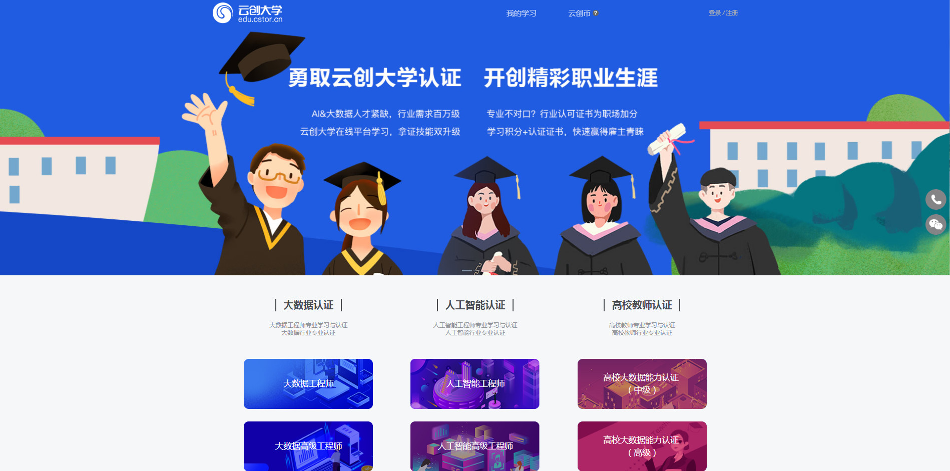 云創(chuàng)大數(shù)據(jù)已于2020年3月18日(云創(chuàng)大數(shù)據(jù)9周年紀(jì)念日)推出了集大數(shù)據(jù)、人工智能線上學(xué)習(xí)與考證機(jī)制于一體的線上平臺,培訓(xùn)、實(shí)驗(yàn)、認(rèn)證、就業(yè)推薦四位一體,通過積分制,使學(xué)員獲得專業(yè)的技術(shù)知識與實(shí)踐技能,擁有更多職業(yè)優(yōu)勢。