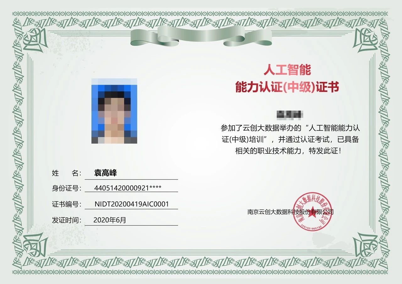 對于參加培訓(xùn)的學(xué)員,完成培訓(xùn)統(tǒng)一頒發(fā)“結(jié)業(yè)證書”;通過云創(chuàng)認(rèn)證考試且成績合格,才能獲得“人工智能能力認(rèn)證(中級)證書”,以此作為專業(yè)技術(shù)人員職業(yè)能力考核的證明。在培訓(xùn)結(jié)束后,可在云創(chuàng)大數(shù)據(jù)官方網(wǎng)站查詢“人工智能能力認(rèn)證(中級)證書”信息。