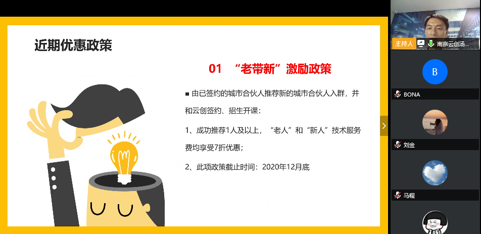 為了進一步拓展合作規(guī)模,使更多合伙人能夠在全國各個城市推進云創(chuàng)青少年人工智能學(xué)院成熟的商業(yè)模式,9月22日下午,云創(chuàng)大數(shù)據(jù)在騰訊會議線上舉辦了云創(chuàng)青少年人工智能學(xué)院城市合伙人大會,現(xiàn)有城市合伙人和有意向成為城市合伙人的行業(yè)同仁蒞臨參會。