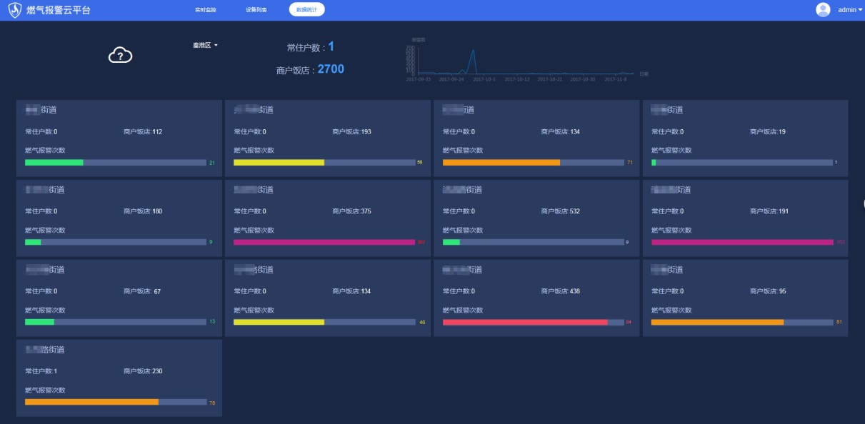 管理員可通過數(shù)據(jù)統(tǒng)計(jì)功能查看當(dāng)前區(qū)域的實(shí)時(shí)天氣狀況、常駐戶數(shù)、商戶飯店數(shù)、當(dāng)前區(qū)域的報(bào)警統(tǒng)計(jì)展示,包括區(qū)域報(bào)警折線圖、街道的常駐戶數(shù)、商戶飯店數(shù)量、燃?xì)鈭?bào)警次數(shù)。