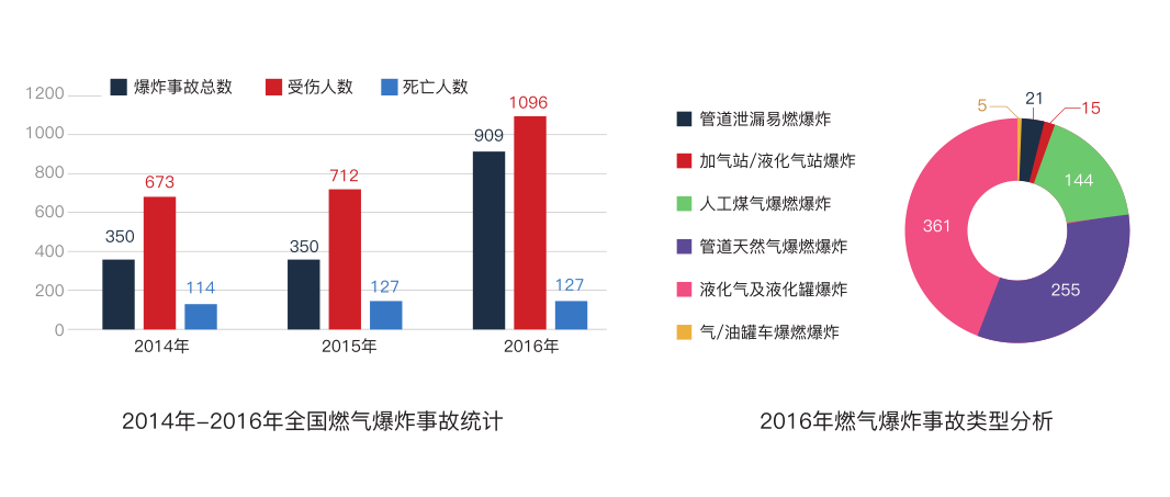 燃?xì)獾陌踩褂弥苯雨P(guān)系人民群眾的生命財(cái)產(chǎn)安全和社會(huì)的安全穩(wěn)定,但目前燃?xì)獗ㄊ鹿蕝s屢見不鮮。據(jù)燃?xì)獗ü娖脚_(tái)統(tǒng)計(jì),2014年-2016年的全國爆炸事故數(shù)據(jù)如下圖所示,其中僅2016年燃?xì)獗ㄊ鹿示陀?09起,共造成127人死亡、1096人受傷。