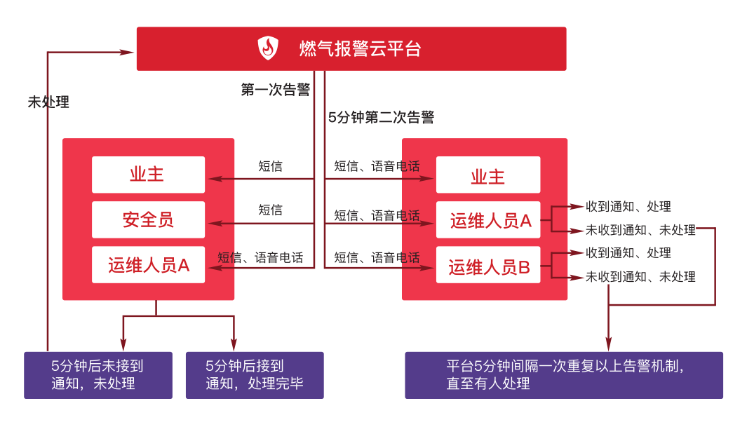 如果在五分鐘后,第一運(yùn)維人員沒有接收到此次告警處理信息,也就是未打開APP查看日志,平臺(tái)會(huì)第二次發(fā)送短信,電話語音通知給業(yè)主、第一運(yùn)維人員,第二運(yùn)維人員;任意運(yùn)維人員接收告警信息并處理此次告警,則告警流程結(jié)束。