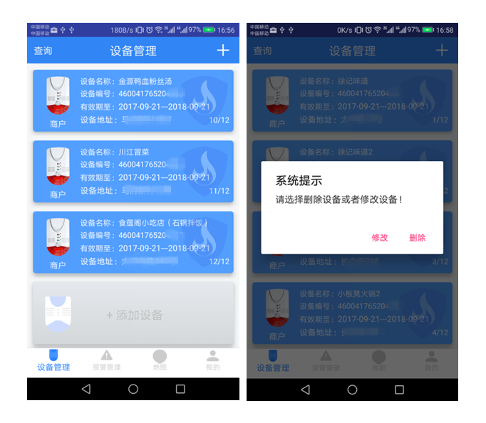 管理員通過PC端和移動(dòng)端,可完成設(shè)備的添加、修改和刪除等,選擇某一具體設(shè)備點(diǎn),將展示該設(shè)備的詳細(xì)信息(設(shè)備名、聯(lián)系方式、設(shè)備號(hào)、地址)和報(bào)警記錄。