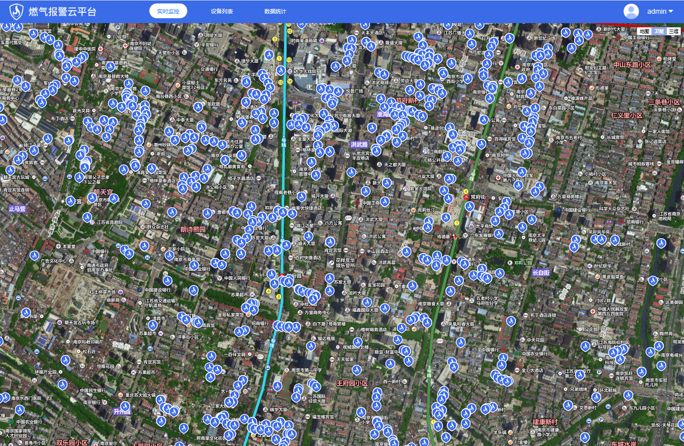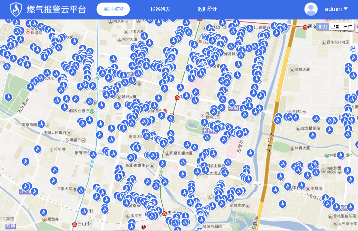 - 平臺(tái)支持地圖展示功能,標(biāo)注了平臺(tái)內(nèi)所有燃?xì)鈭?bào)警監(jiān)控點(diǎn)位信息,以不同顏色區(qū)分設(shè)備的不同狀態(tài),藍(lán)色代表設(shè)備在線、灰色代表設(shè)備離線、紅色代表設(shè)備報(bào)警,并進(jìn)行日常管理。